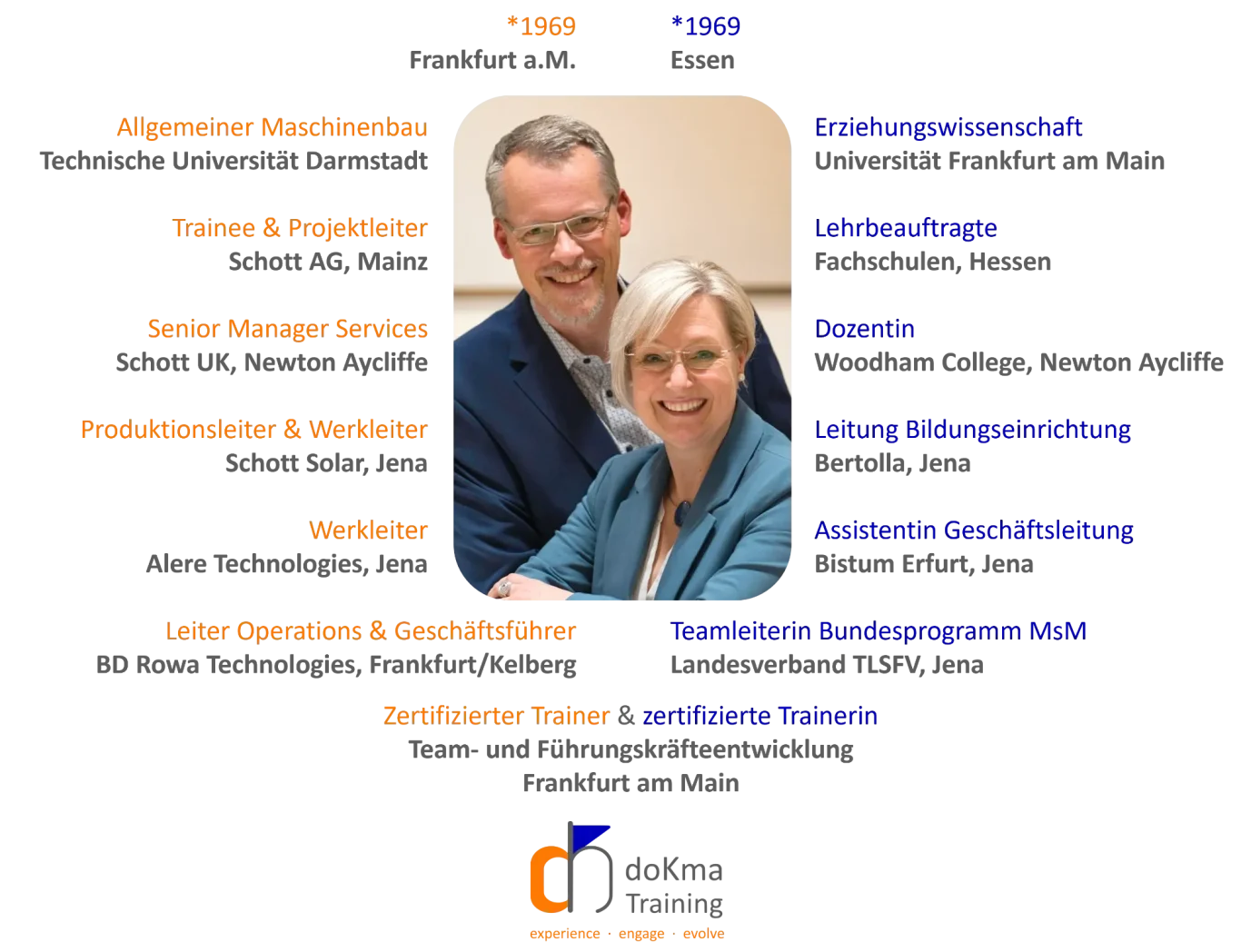 Als berufliches Team und Ehepaar (mit jahrzehntelanger Übung 😉) bringen wir nicht nur umfangreiche Fachkompetenz in verschiedenen beruflichen Feldern mit, sondern auch eine reichhaltige Lebens- und Berufserfahrung. Diese Kombination ermöglicht es uns – neben der Konzeption von wirkungsvollen Trainings und Workshops -, tiefgehend und umfassend zu beraten. (mehr)