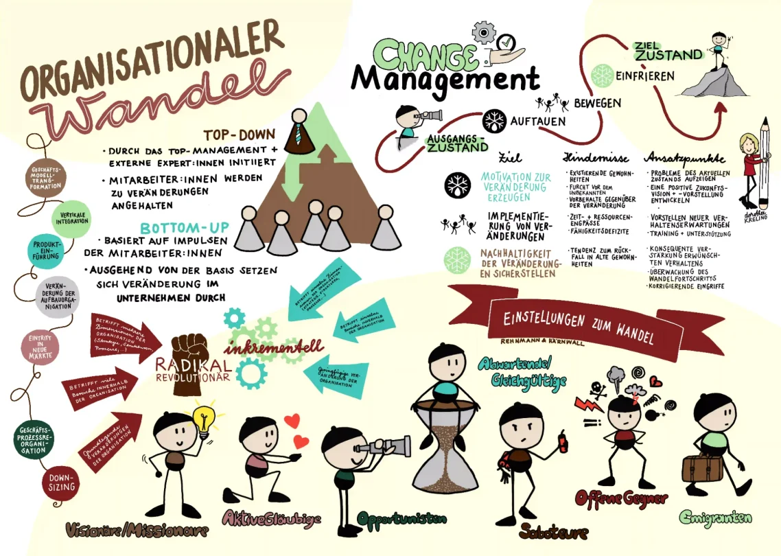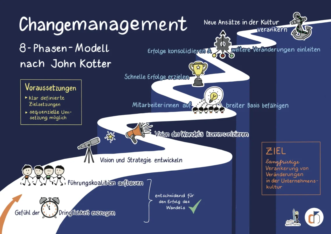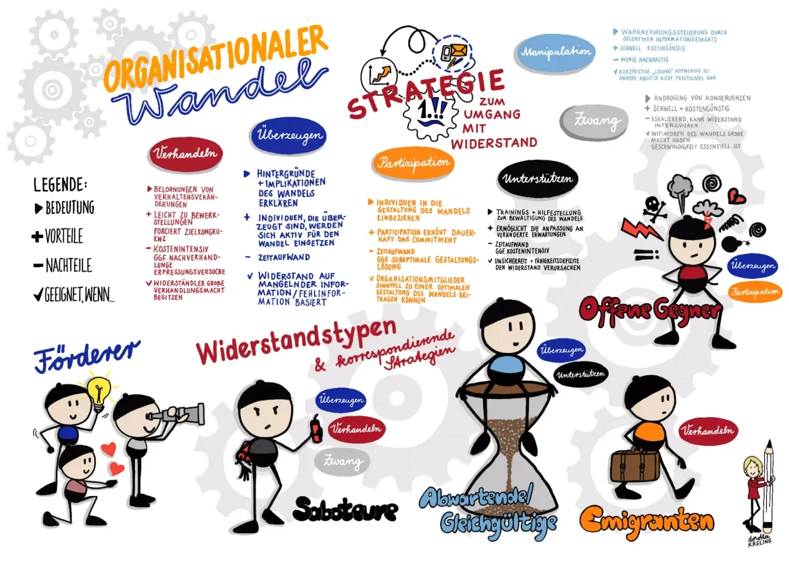 Dann schaffen wir ein Bewusstsein bei den Verantwortlichen für das ungewöhnliche Verhalten von Menschen im Change. Und danach begleiten wir euch durch den gesamten Prozess bis zur Verankerung.